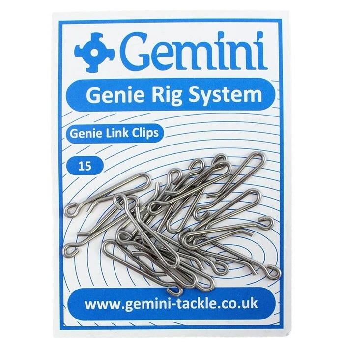 Gemini Genie Link Clips are a quick and easy link clip for attaching your rigs to shock leaders and sinkers. Made from stainless steel 1.2mm dia. wire with a length of 24mm. Its a super strong way to enable you to switch between rigs and leads helping you get back in the water faster.