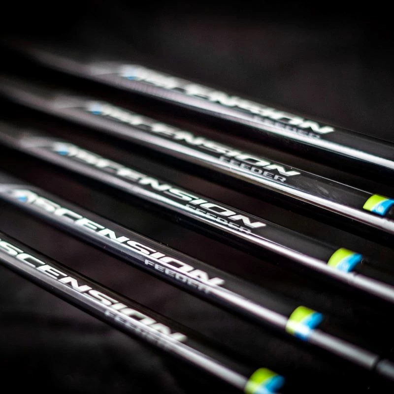 Preston’s Ascension feeder series aims to give you a high quality rod range designed to cover every eventuality you’ll face on commercial and natural venues alike. Created in conjunction with international match consultants Lee Kerry and Arnout Van De Stadt with an extensive testing and development cycle. There are 5 models to choose from. The shorter 3.2 and 3.4m options feature a soft action that makes them perfect for close range work targeting roach, skimmers. While the 3.6m 60g rod makes a brilliant all rounder with enough backbone to propel larger feeders, but enough tip sensitivity to cushion fish at close range. Finally the 3.8 and 4m offerings make ideal distance casting big water rods.