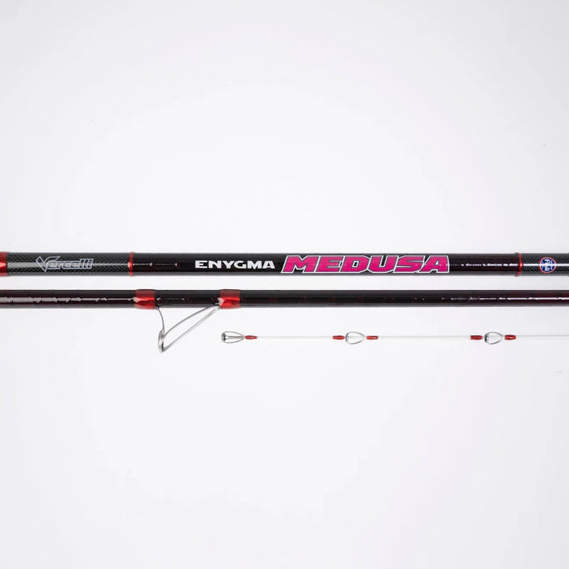 The Vercelli Enygma is a 13.7ft beachcaster with a 100% carbon fibre blank and features high-quality Fuji LC low rider O guides and a Fuji DPS reel seat. Featuring a competition solid carbon spliced hybrid tip with reinforced metal ferrules. They make a great all-round beachcaster for clean and medium ground carrying a 200g casting weight and coming supplied in a Vercelli rod bag.